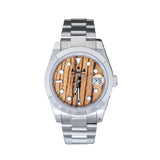This timepiece blends timeless design with natural character, featuring a dial crafted from Zebrawood—its bold, striped grain giving every watch a unique personality. A practical date window keeps you on schedule, while the sporty Oyster-style bracelet adds durability making it a great daily wear. The result is a watch that balances classic elegance with everyday performance, offering one-of-a-kind style that’s built to move with you.