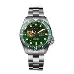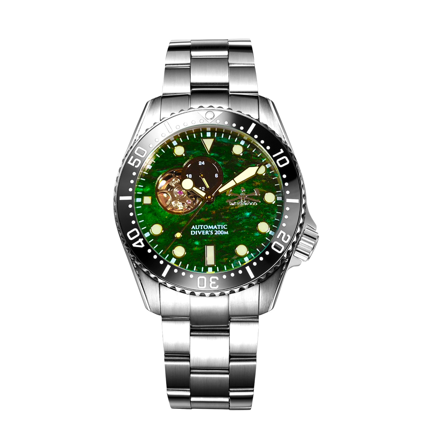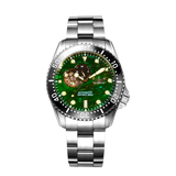 Introducing the Seawolf dive watch - an extraordinary timepiece that embraces the spirit of exploration. Crafted to brave the elements, the Seawolf is your trusted companion for life’s adventures. Its sturdy stainless steel case, reinforced by a screw-down crown and case back, ensures unrivaled durability, making it a true companion for those who seek adrenaline and excitement. The precision and reliability of Miyota automatic movement ensures accurate timekeeping even in the harshest conditions. Its sapphire crystal safeguards the natural Green Turquoise stone dial beneath adding a touch of luxury and allure to its rugged nature. With a water resistance of up to 200 meters, dive into the unknown and redefine what it means to go beyond limits.